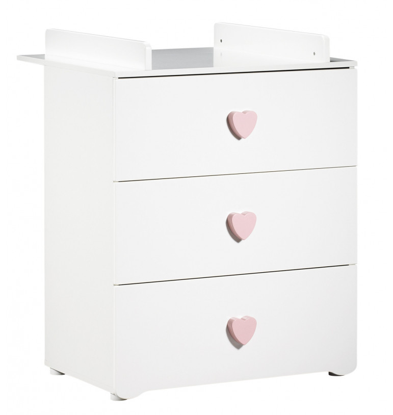 Commode 3 tiroirs boutons "coeur" rose tendre avec dispositif à langer (amovible) inclus