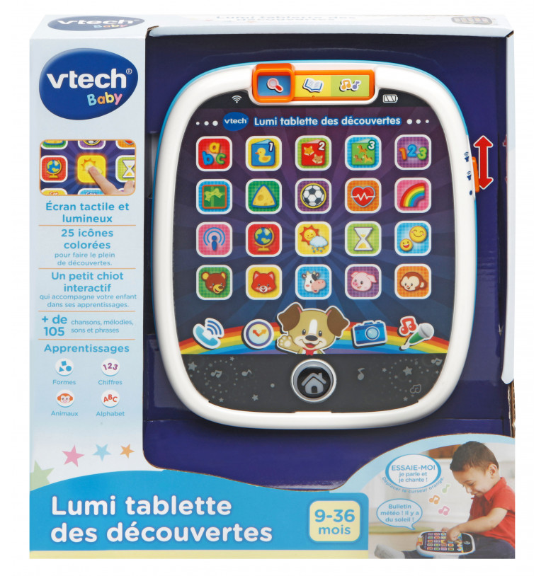25 touches tactiles dont 20 lumineuses pour faire le plein de découvertes : les chiffres de 1 à 10, les formes, l'alphabet en chanson, les animaux, découvrir le temps qu'il fait, écouter son ami le chien parler.