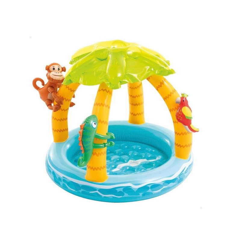 Laissez-vous séduire par le design original et trop mignon de la pataugette tropicale Intex. Le palmier géant offre de l'ombre à vos enfants, tandis que les animaux exotiques les plongent dans un univers tropical. Entouré d'un caméléon, d'un perroquet et d'un singe gonflable, ils pourront s'amuser et s'inventer un tas d'histoires imaginaires. Cette mini piscine colorée apportera une touche de fraîcheur dans votre jardin et amusera vos petits tout l'été.