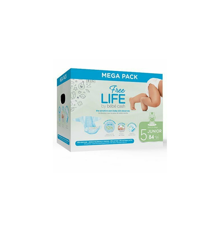 Douceur et absorption maximum Disponibles en différentes tailles (de la taille Prématuré à la taille XL), les couches Freelife by Bébé Cash protègent les bébés au cours de leurs premières années. La forme anatomique de la couche suit parfaitement les formes du corps de bébé, ce qui lui permet de bénéficier dune totale liberté de mouvement. Le voile supérieur doux des couches permet déviter les érythèmes et la poudre absorbante diffuse rapidement le liquide pour que bébé reste bien au sec. Les barrières anti-fuites situées à lintérieur de la couche apportent une protection supplémentaire. Les attaches de la couche peuvent être ouverts et fermés encore et encore. Il est ainsi facile de vérifier si bébé a besoin dêtre changé. Caractéristiques techniques des produits Freelife : - Gamme Hypoallergénique - Garantis sans TBT (tributylétain, composé organique de létain) - Sans paraben ou autres substances biocides, - Non chlorés, - Sans latex, lotion adoucissante, colorant ou parfum, - Origine de la ouate de cellulose garantis SFI, - Technologie EXTRA DRY qui permet une absorption rapide de la couche dacquisition, - Testés dermatologiquement. Double matelas absorbant La couche dacquisition fluff avec SAP fait pénétrer rapidement lurine à lintérieur du double tampon. Le change est sec en surface, la peau de bébé est préservée et reste douce. Technologie Supercore Le change plus fin et plus souple offre à bébé une liberté de mouvement tout en lui garantissant une absorption optimale. Voile respirant intégral Le voile et les ailes élastiques micro aérés permettent à la peau de bébé de respirer. Toucher textile Le revêtement «textile» intérieur et extérieur garantit à bébé douceur et confort. Design très coloré Revêtement textile et velcro frontal imprimés avec différents animaux selon la taille. Maintien parfait La forme adaptée et le système dattaches velcro « elastic ears » très résistant garantissent à bébé une liberté de mouvement. La couche reste en place même quand bébé se déplace. Protection maximale Les barrières anti-fuite et les élastiques latéraux offrent une double protection contre les fuites. La couche bouge avec bébé et lui assure confort et sécurité.
